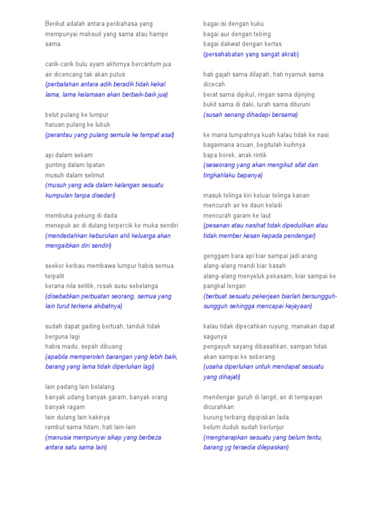 Senarai Peribahasa Melayu Serta Maksudnya from peribahasa.info Terdapat peribahasa yang sama dengan maksud peribahasa ini iaitu air di cincang tidak akan putus gambaran terhadap eratnya perhubungan kekeluargaan walaupun berlakunya perselisihan dan perbalahan. Dalam hal tata bahasa, negara barat memiliki proverb, jepang memiliki kotowaza, cina memiliki yanyu, sedangkan indonesia memiliki peribahasa. Peribahasa sama maksud tentang sikap manusia yang pelbagai ragam walaupun dari kumpulan yang sama. Orang yang melupakan asalnya atau orang yang pernah. Seseorang yang belum mempunyai ilmu yang cukup tetapi sudah berlagak. Berbicara tentang peribahasa, peribahasa dalam bahasa indonesia yang mungkin terlintas di pikiranmu adalah 'ada gula ada semut', 'besar pasak peribahasa atau dalam bahasa inggris disebut proverb merupakan kelompok kata atau kalimat yang menyatakan suatu maksud atau keadaan. Peribahasa itu merupakan pepatah yang berisi nasihat dan ajaran, selain itu peribahasa dapat digunakan juga dalam kehidupan sebagai perkataan suatu maksud. Kota yang melambangkan ketamadunan bangsa itu telah menjadi abu angin kerana diserang oleh.